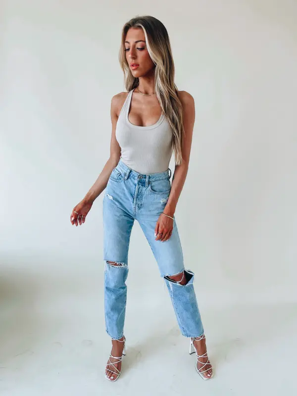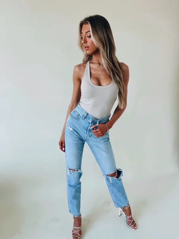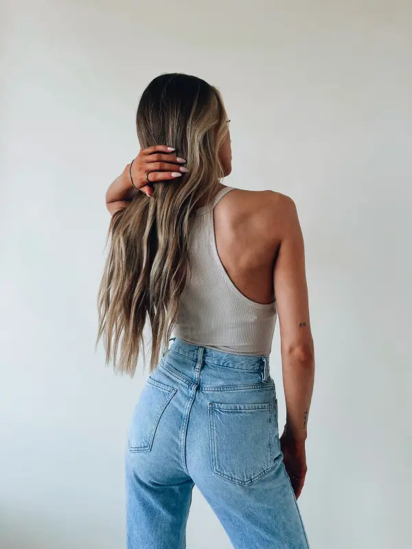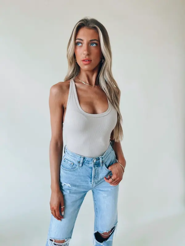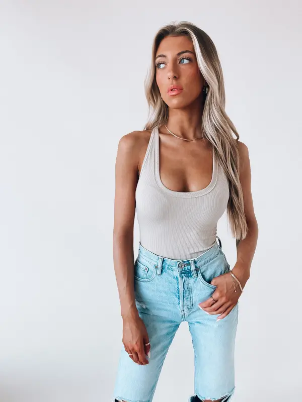 Our Basic Ribbed Khaki Bodysuit is a fitted bodysuit with a scoop neckline. There is a snap button closure on the bottom. This item is the perfect basic for your closet.