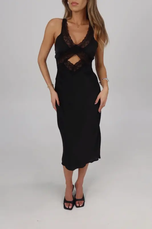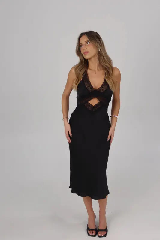 The Elodie Lace Satin Midi Dress combines timeless elegance with modern details. This sophisticated black midi features an alluring V-neckline adorned with delicate black lace trim and a romantic keyhole detail beneath the bust. The empire waistline creates a flattering silhouette, while thick tank straps provide comfortable support. A stunning criss-cross lace detail graces the back, adding an unexpected touch of drama. Thoughtfully designed with a hidden side zipper and full lining, this relaxed-fit dress moves beautifully with you. True to size for effortless styling.