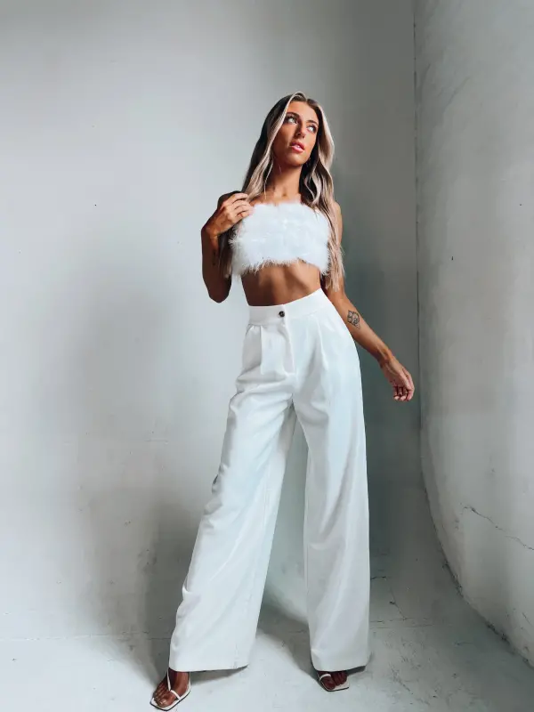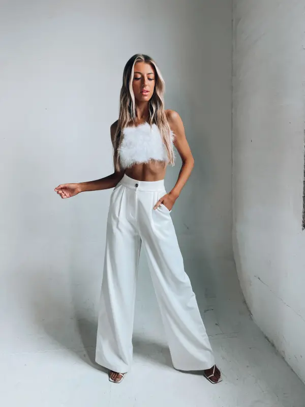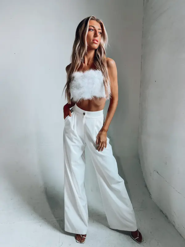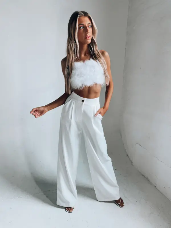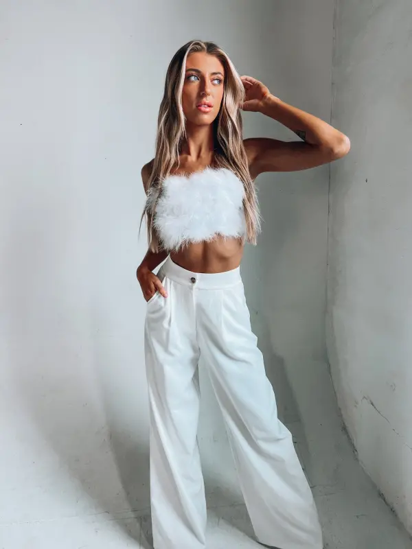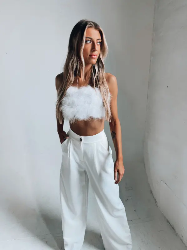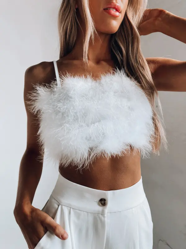 Our Feather Crop Top in Crisp is an ultra cropped top that features full feather embellishment on the front andthin spaghetti straps.
