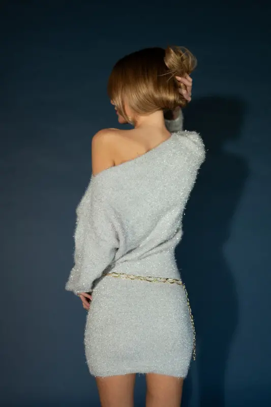 Our Silver Shimmer Knit Mini Dress is the perfect piece for your holiday festivities. This stunning silver textured knit dress features a relaxed-fit bodice that gracefully flows into a fitted skirt, creating a flattering silhouette. The slouchy off-the-shoulder neckline adds a touch of effortless elegance, while silver tencel threads woven throughout give the dress a soft shimmer that catches the light beautifully. Whether you're dressing up for a party or a night out, this mini dress combines comfort, style, and sparkle for an unforgettable look